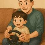 子どもがハンドル型のコントローラーをもって、それをパパが後ろから支えるような形で、