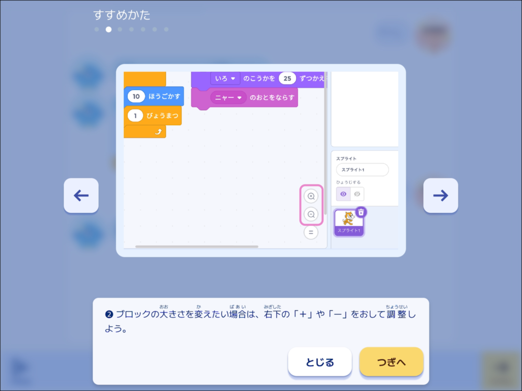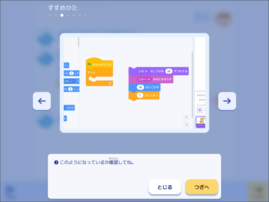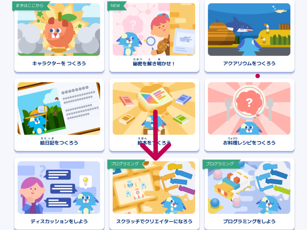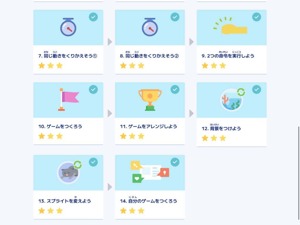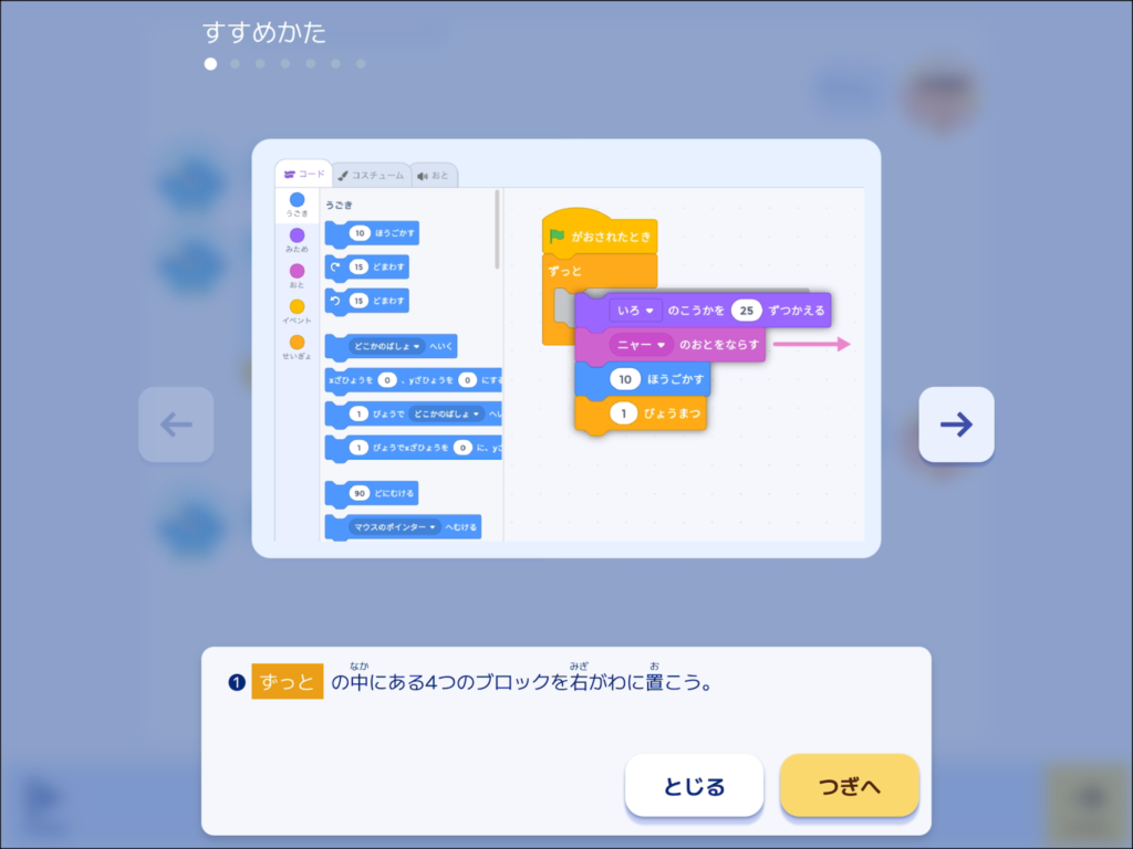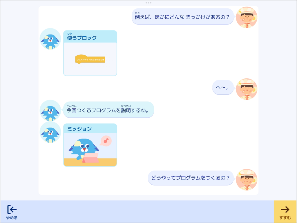 ミッションの順番に取り組むだけで、簡単にプラグラミングの世界に飛び込めます。