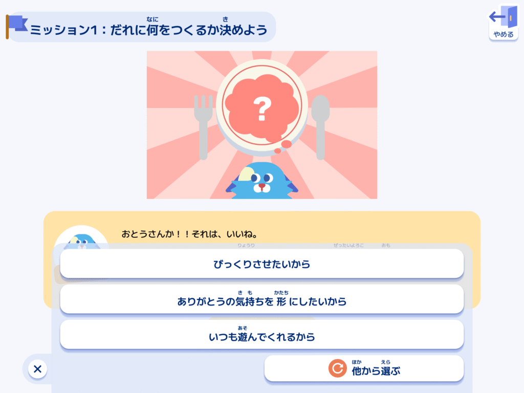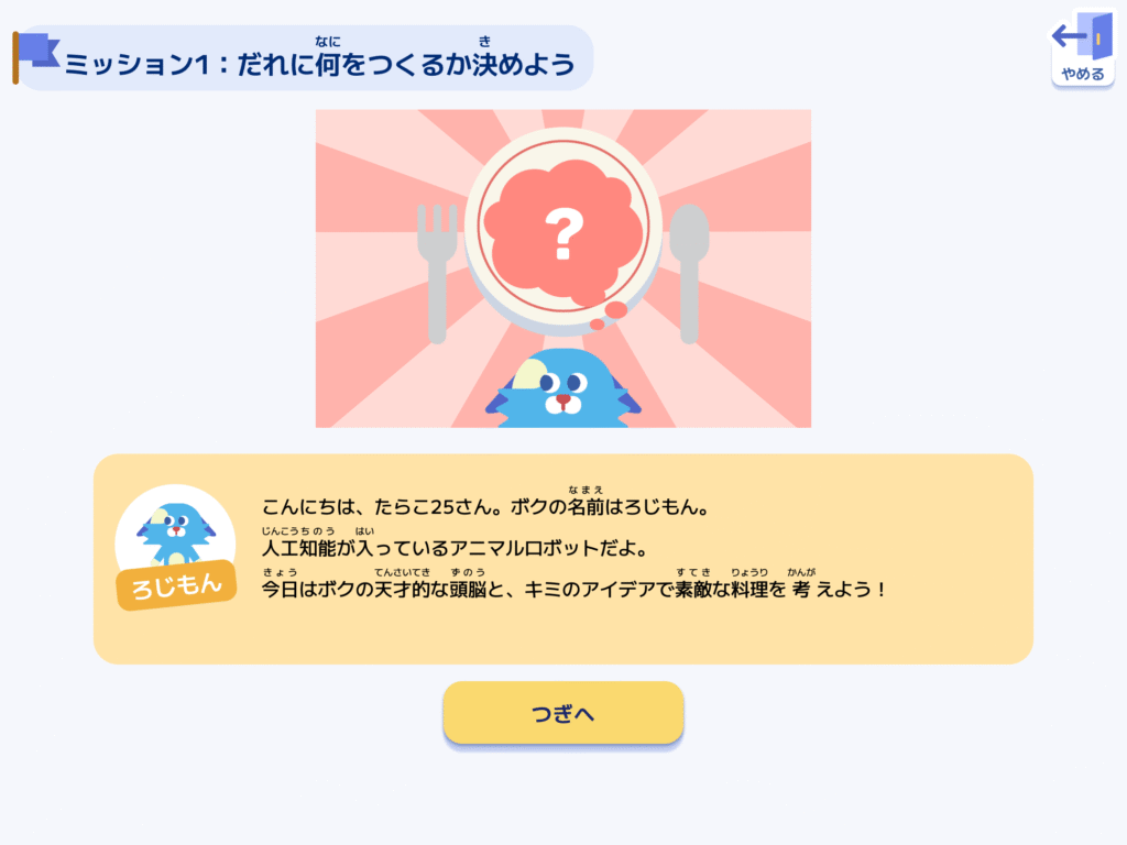探求教材は、「ろじもん」くんと会話しながら、作るものを決めていきます。