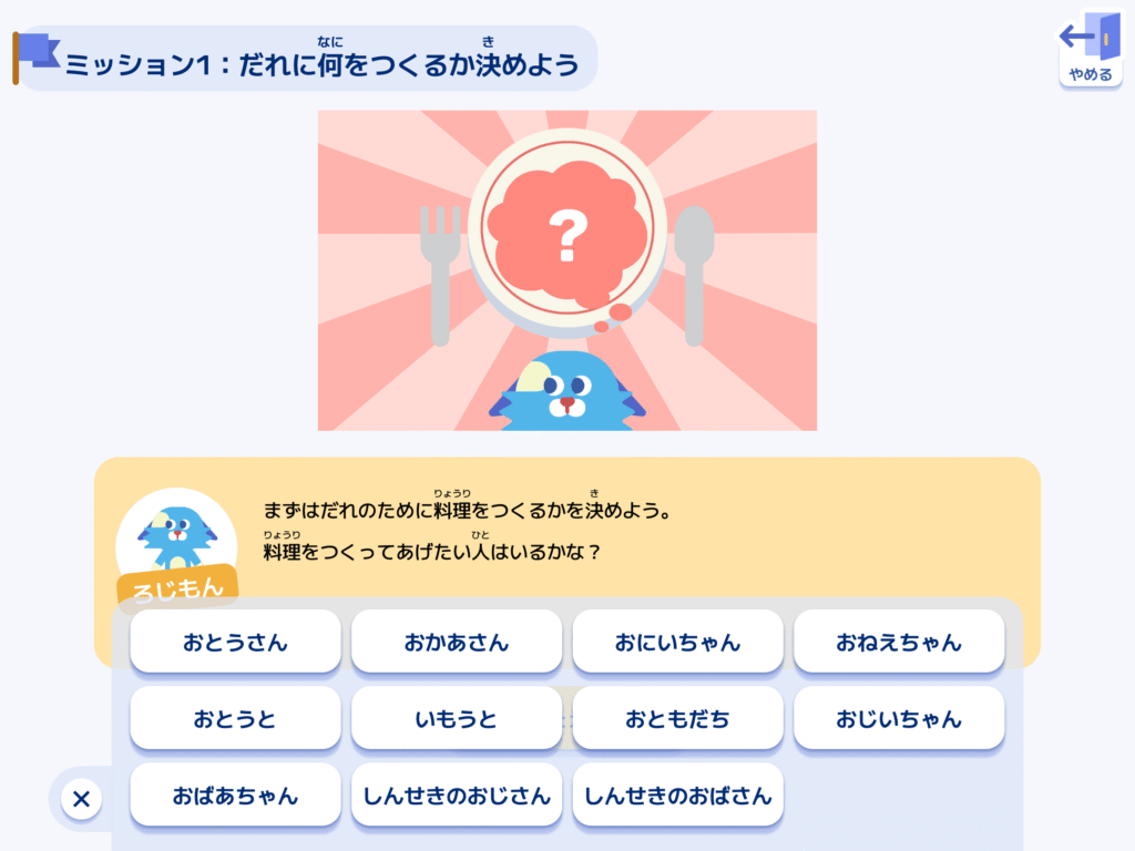 最初の質問は、「料理を作ってあげたい人はいるかな?」