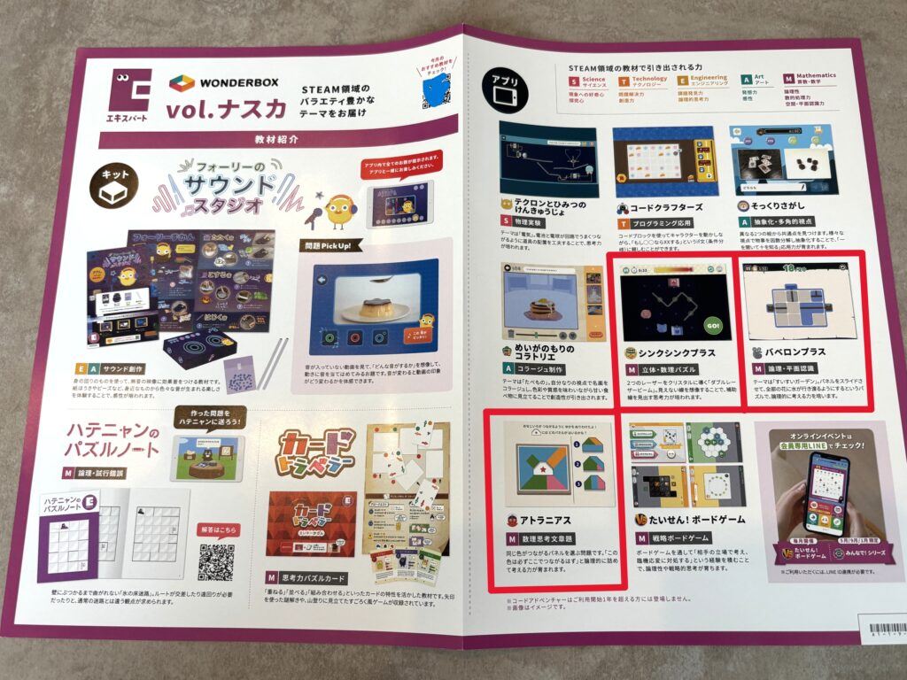 | 共通する問題 | ①シンクシンクプラス ②バベロンプラス ③アトラニアス (ウチ調べ計136種類) その他にも多数のアプリや体験キット | ①~③はほとんど共通。 (ウチ調べ計130種類) さらに、 ・世界と競争 オリンピコ ・発展 レジェンダリオン |