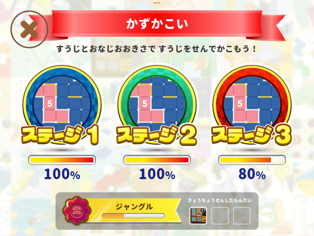 それぞれの問題はレベル1から始まり、クリアするとレベル4まで挑戦可能。