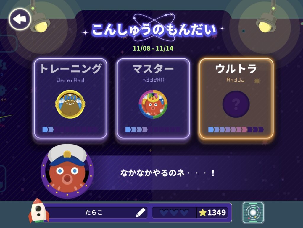 初めは「トレーニング」問題から始まり、クリアすると「マスター」「ウルトラ」と進めます。