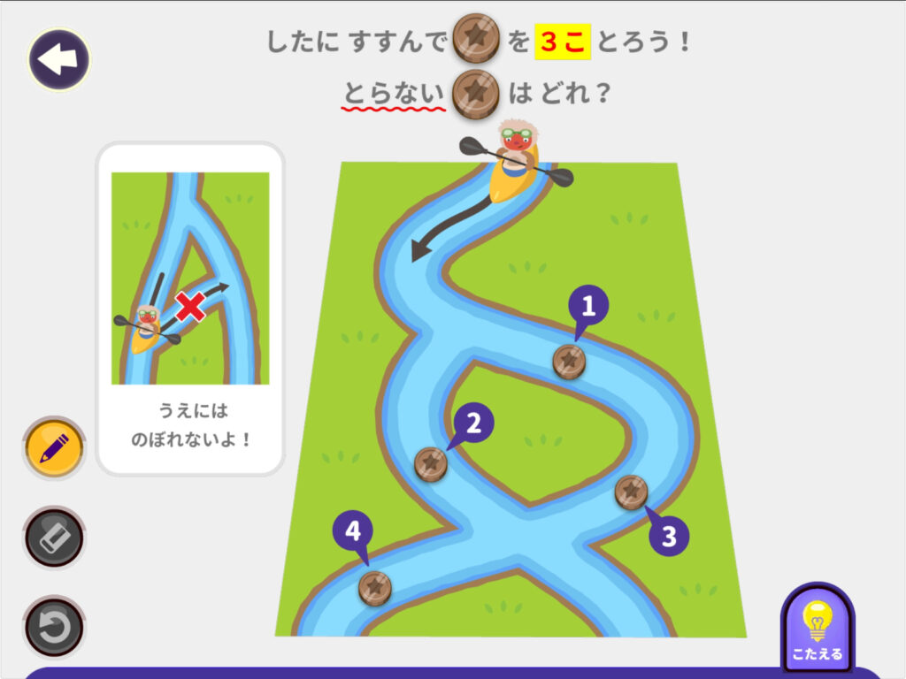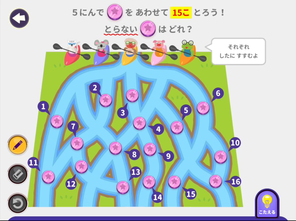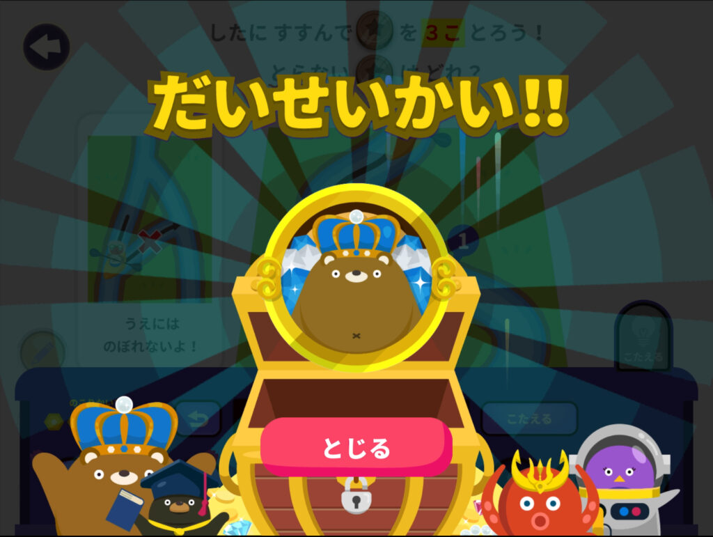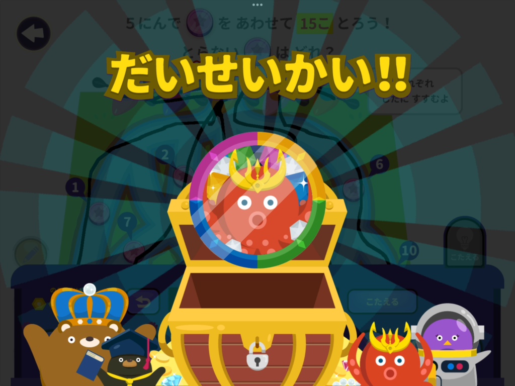 右下の「こたえる」ボタンを押して、正解すると、